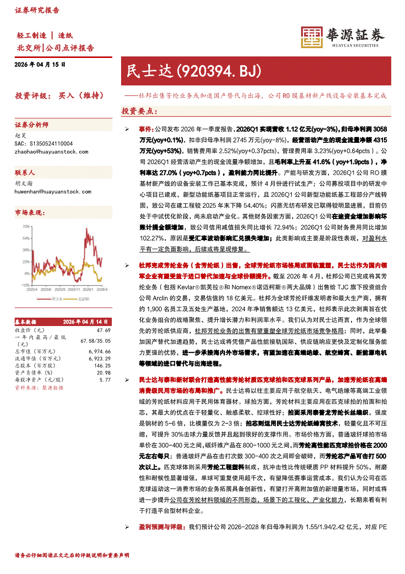 民士达:华源证券-民士达-920394-杜邦出售芳纶业务或加速国产替代与出海,公司RO膜基材新产线设备安装基本完成-260415