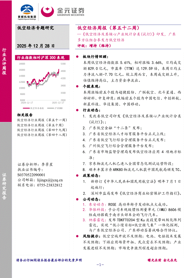 低空经济行业:金元证券-低空经济行业周报(第五十二周):《低空经济及其核心产业统计分类(试行)》印发,广东多方位组合拳发力低空经济-251228