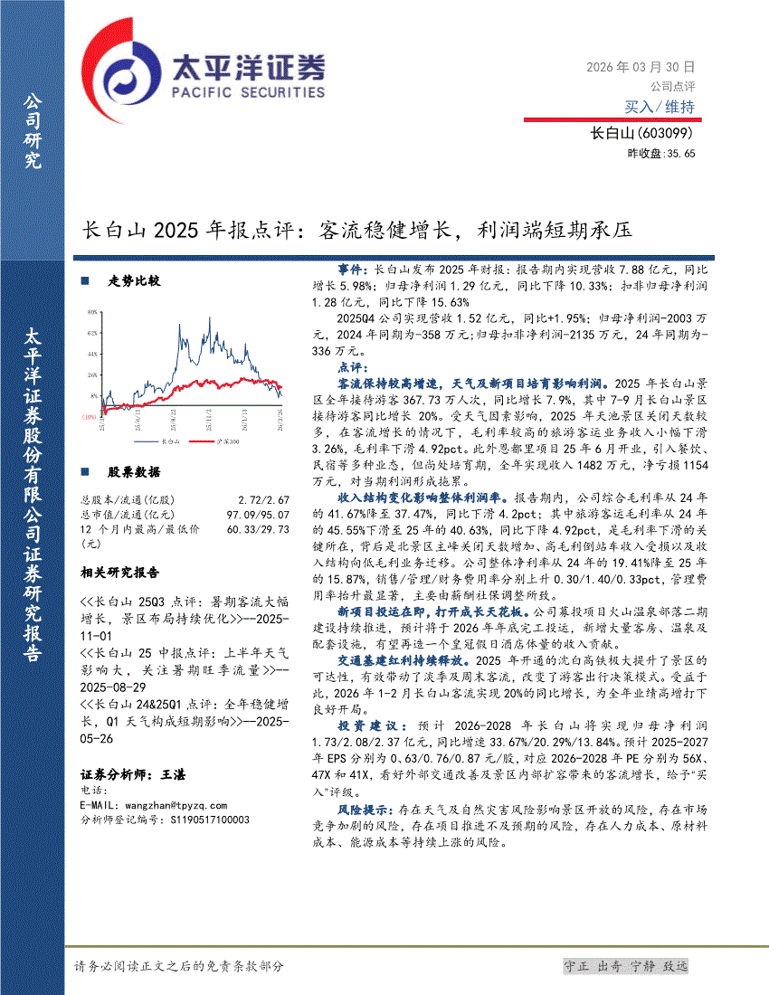 长白山:太平洋证券-长白山-603099-2025年报点评:客流稳健增长,利润端短期承压-260330
