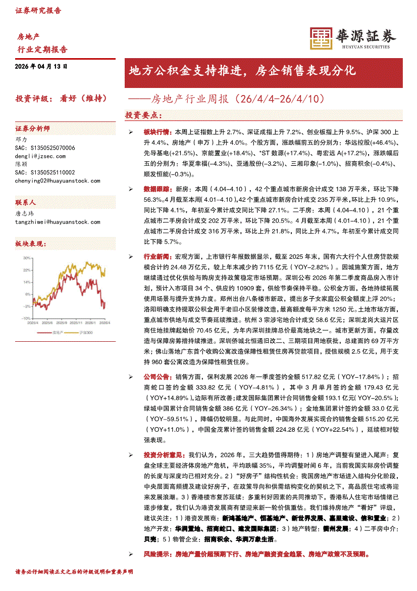 房地产行业:华源证券-房地产行业周报:地方公积金支持推进,房企销售表现分化-260413