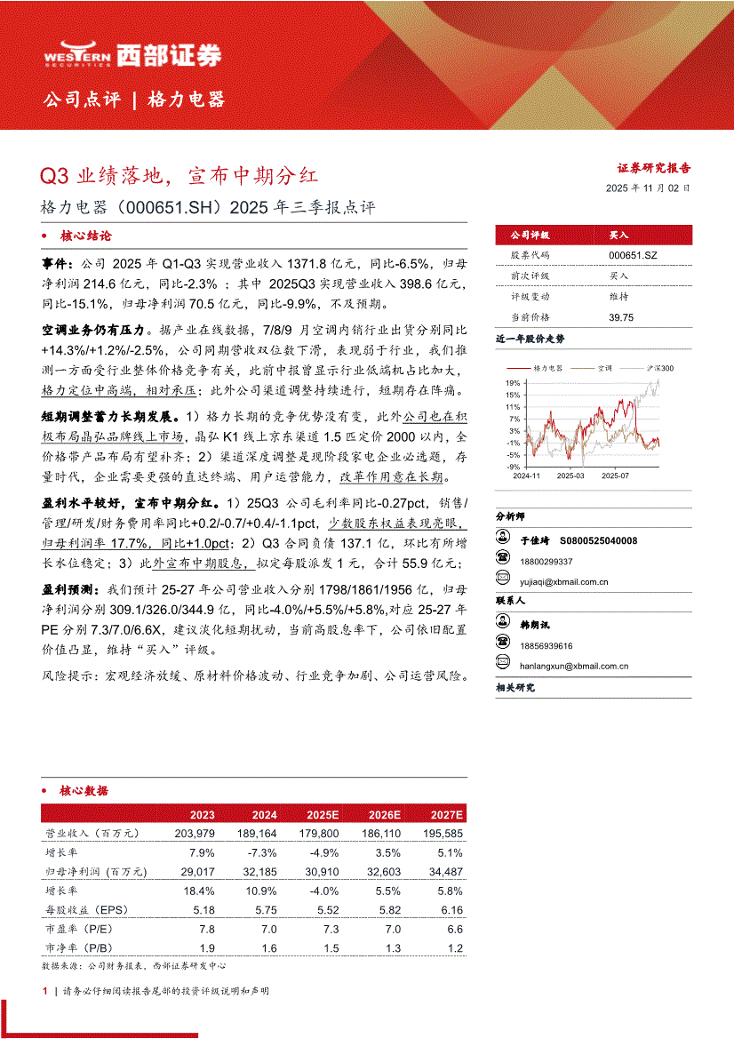 格力电器:西部证券-格力电器-000651-2025年三季报点评:Q3业绩落地,宣布中期分红-251102