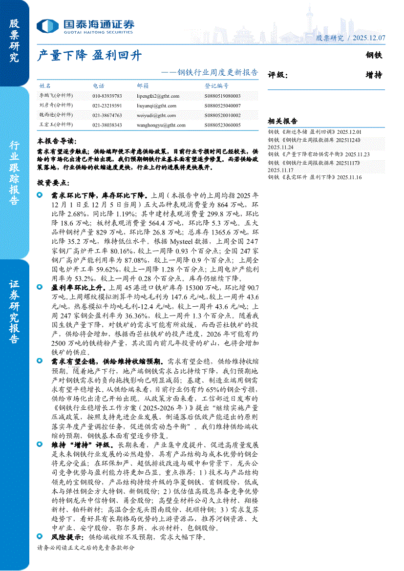钢铁行业:国泰海通证券-钢铁行业周度更新报告:产量下降,盈利回升-251207