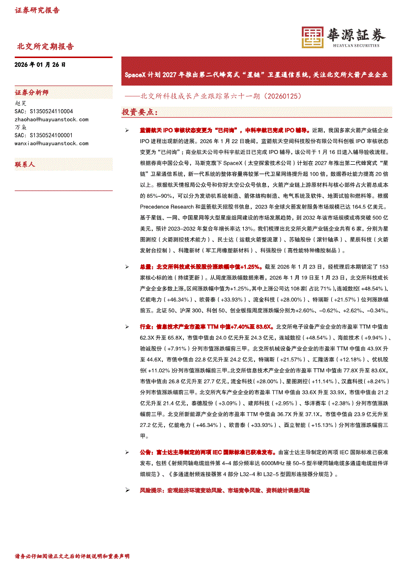 华源证券-北交所科技成长产业跟踪第六十一期:SpaceX计划2027年推出第二代蜂窝式“星链”卫星通信系统,关注北交所火箭产业企业-260126