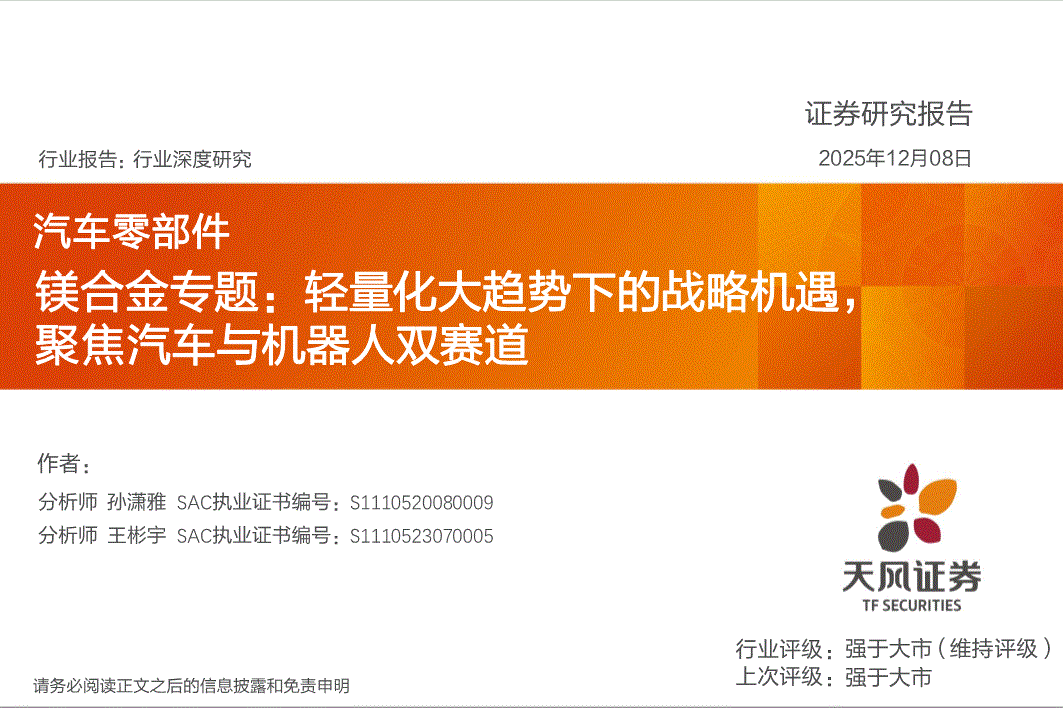 汽车零部件行业:天风证券-汽车零部件行业镁合金专题:轻量化大趋势下的战略机遇,聚焦汽车与机器人双赛道-251208