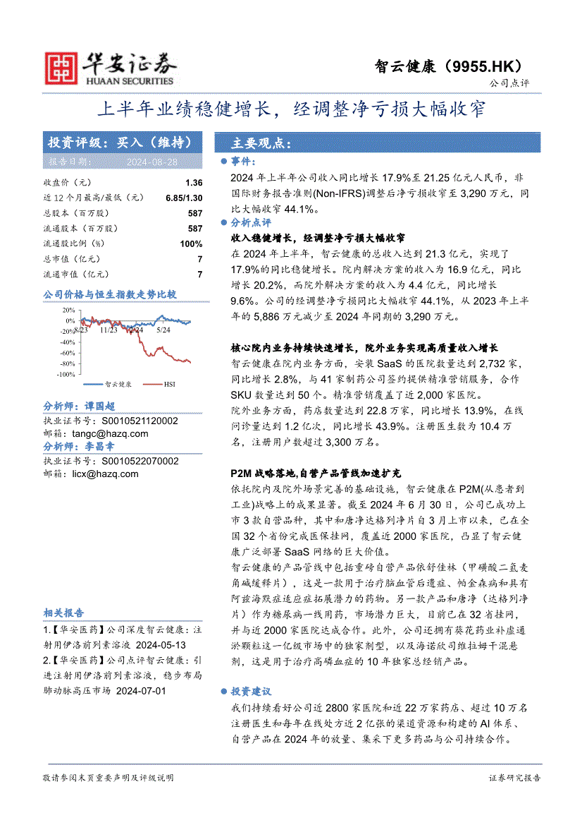 智云健康:华安证券-智云健康-9955.HK-上半年业绩稳健增长,经调整净亏损大幅收窄-240828