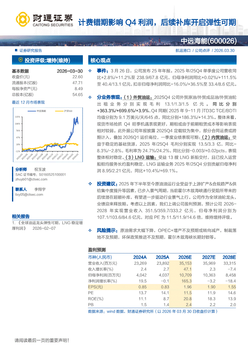 中远海能:财通证券-中远海能-600026-计费错期影响Q4利润,后续补库开启弹性可期-260330