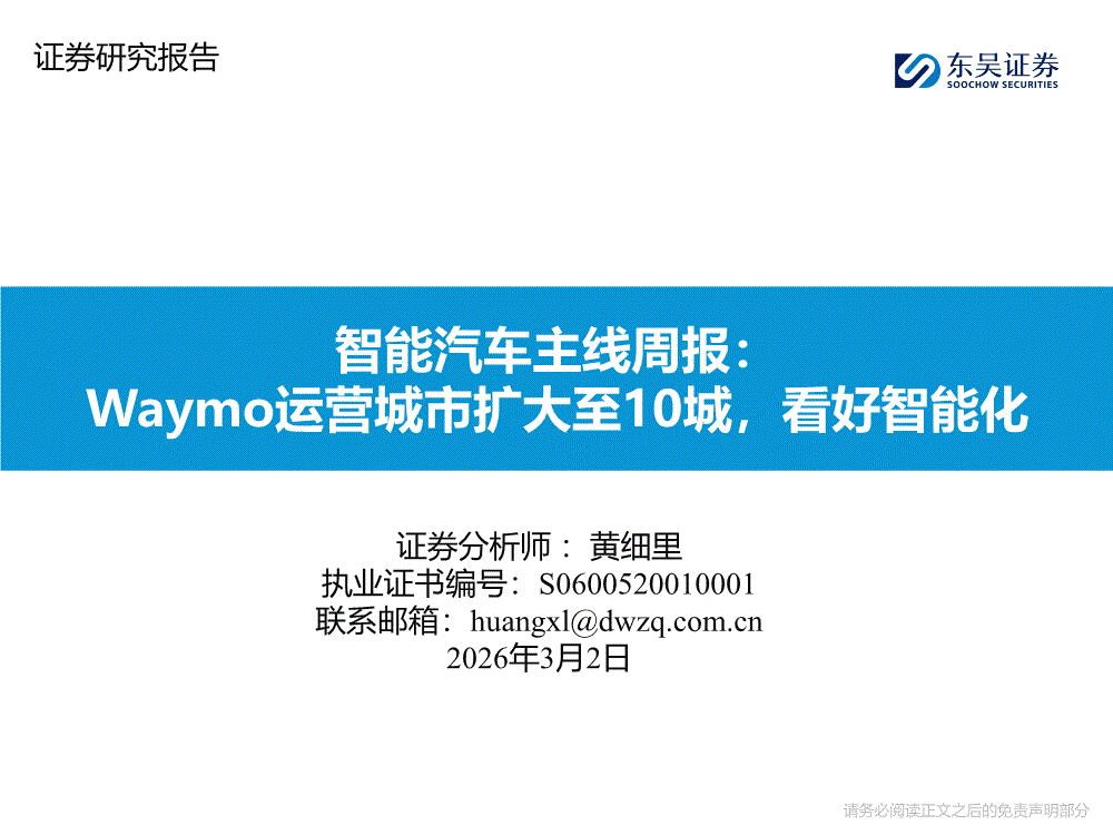 智能汽车行业:东吴证券-智能汽车行业主线周报:Waymo运营城市扩大至10城,看好智能化-260302