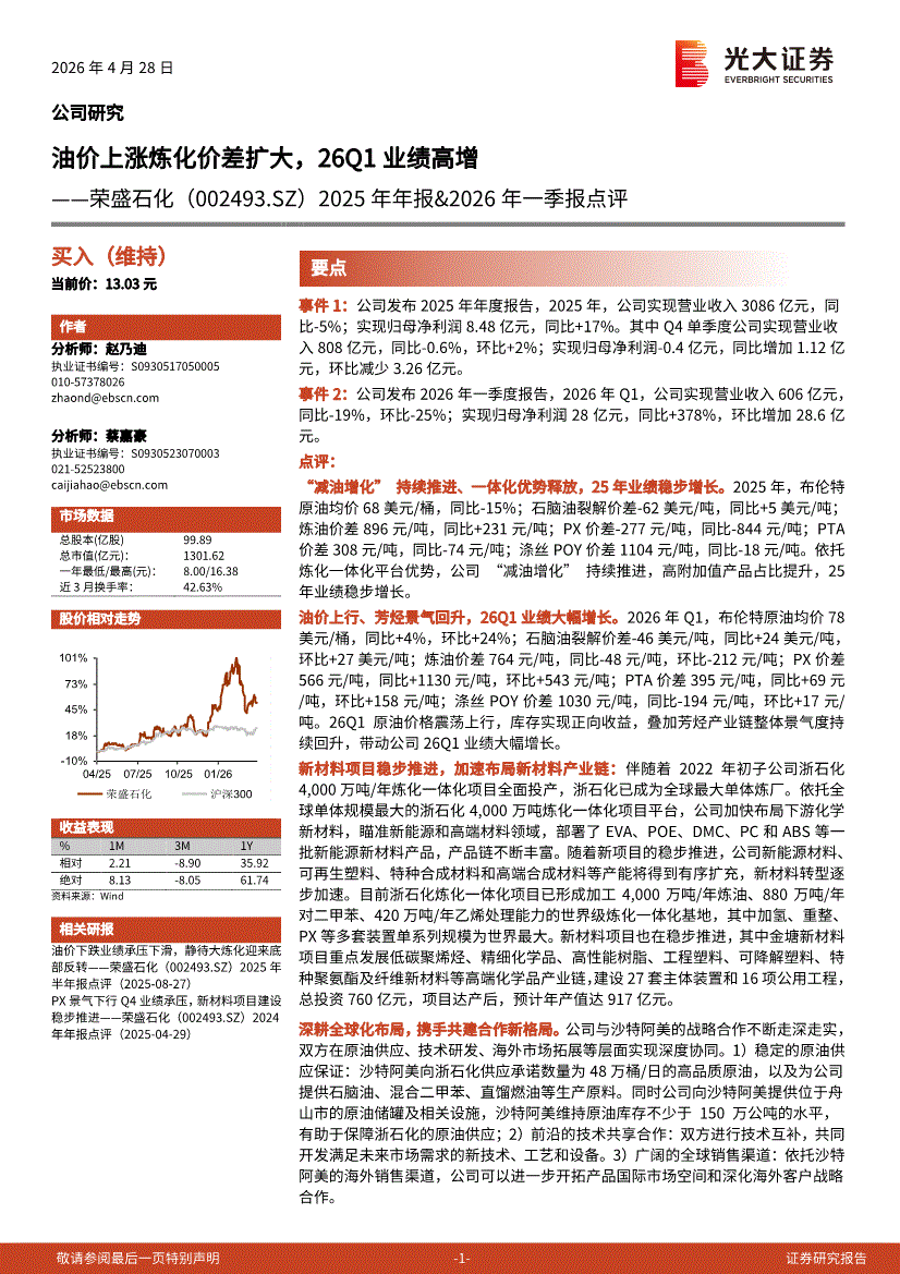 荣盛石化:光大证券-荣盛石化-002493-2025年年报&2026年一季报点评:油价上涨炼化价差扩大,26Q1业绩高增-260428