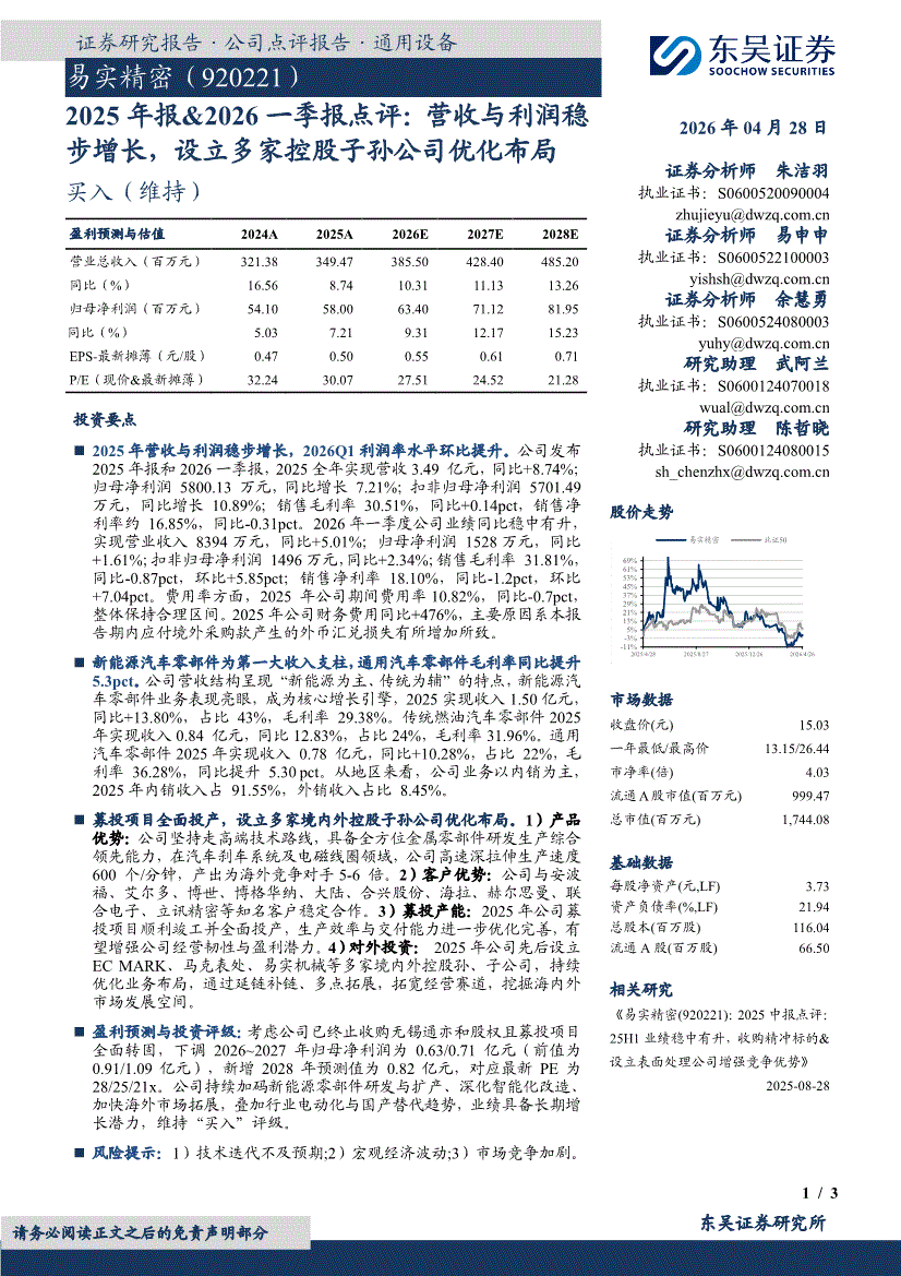 易实精密:东吴证券-易实精密-920221-2025年报&2026一季报点评:营收与利润稳步增长,设立多家控股子孙公司优化布局-260428