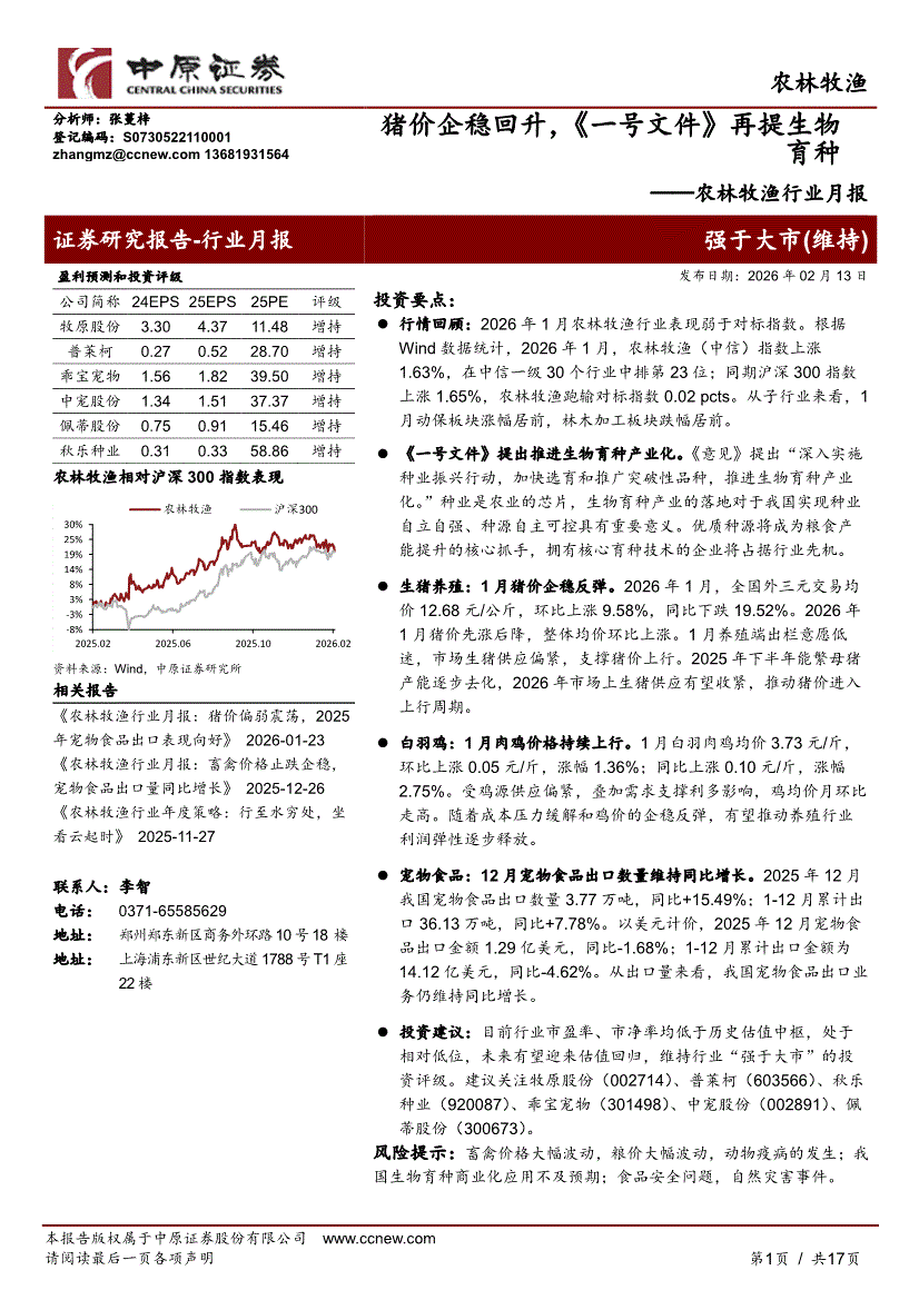 农林牧渔行业:中原证券-农林牧渔行业月报:猪价企稳回升,《一号文件》再提生物育种-260213