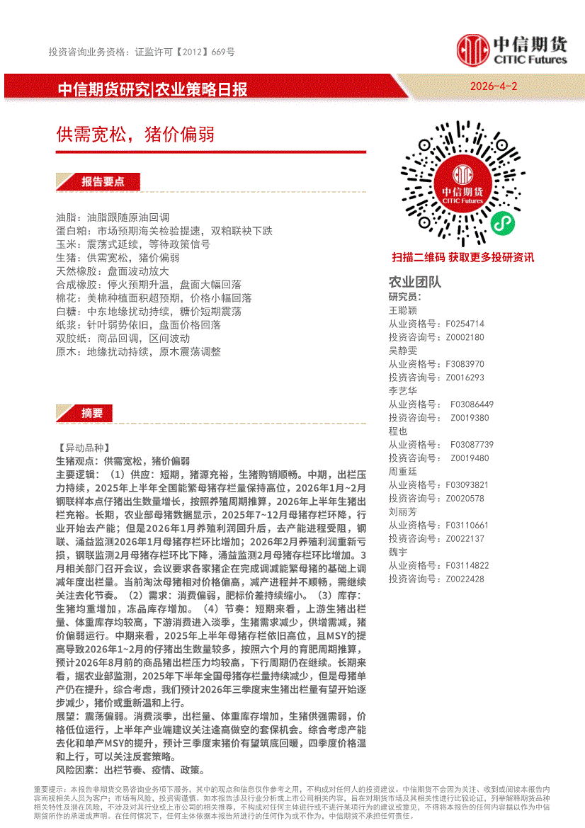 中信期货-农业策略日报:供需宽松,猪价偏弱-260402