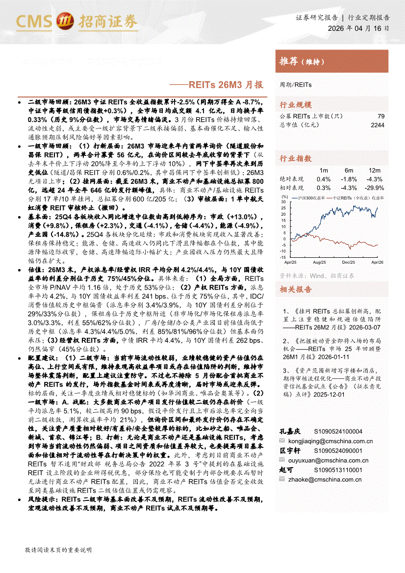 招商证券-REITs行业26M3月报:短期注重防守,市政环保或有预期差-260416
