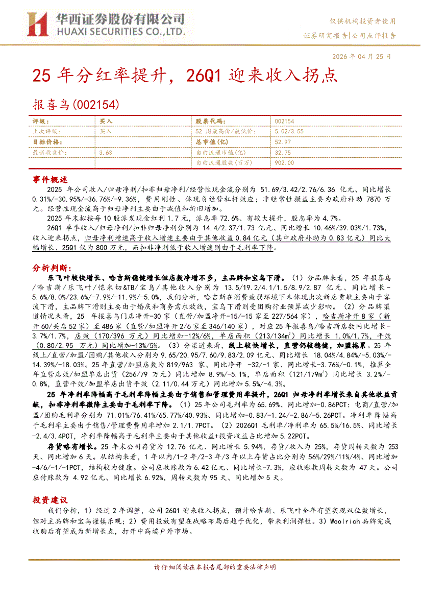 报喜鸟:华西证券-报喜鸟-002154-25年分红率提升,26Q1迎来收入拐点-260425