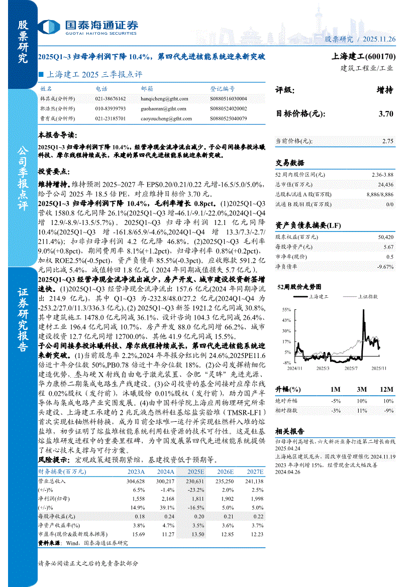 上海建工:国泰海通证券-上海建工-600170-2025三季报点评:2025Q1~3归母净利润下降10.4%,第四代先进核能系统迎来新突破-251126