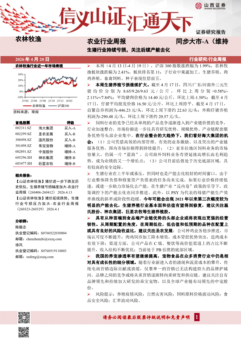 农业:山西证券-农业行业周报:生猪行业持续亏损,关注后续产能去化-260420