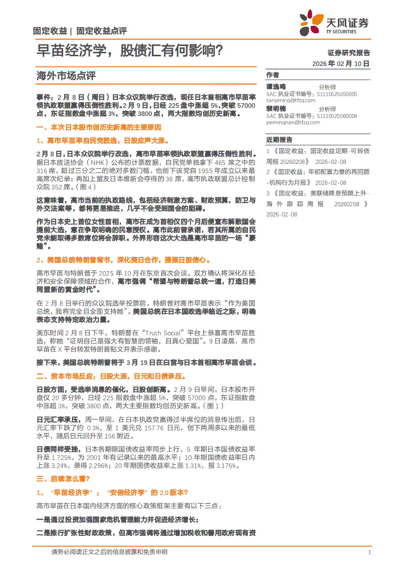 天风证券-海外市场点评:早苗经济学,股债汇有何影响?-260210