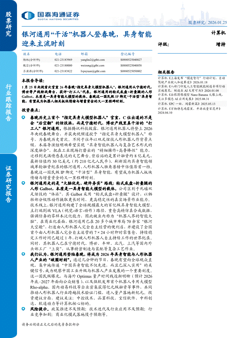 计算机行业:国泰海通证券-计算机行业:银河通用“干活”机器人登春晚,具身智能迎来主流时刻-260125