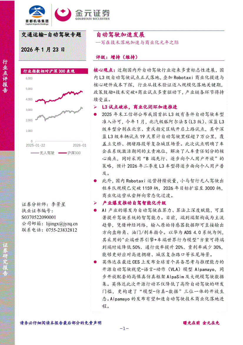 自动驾驶行业:金元证券-交通运输~自动驾驶行业专题:自动驾驶加速发展—写在技术落地加速与商业化元年之际-260123