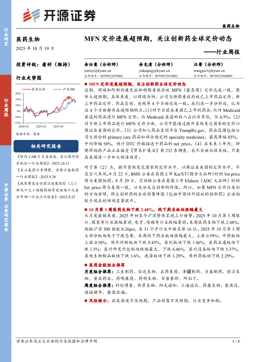 医药生物行业:开源证券-医药生物行业周报:MFN定价进展超预期,关注创新药全球定价动态-251019