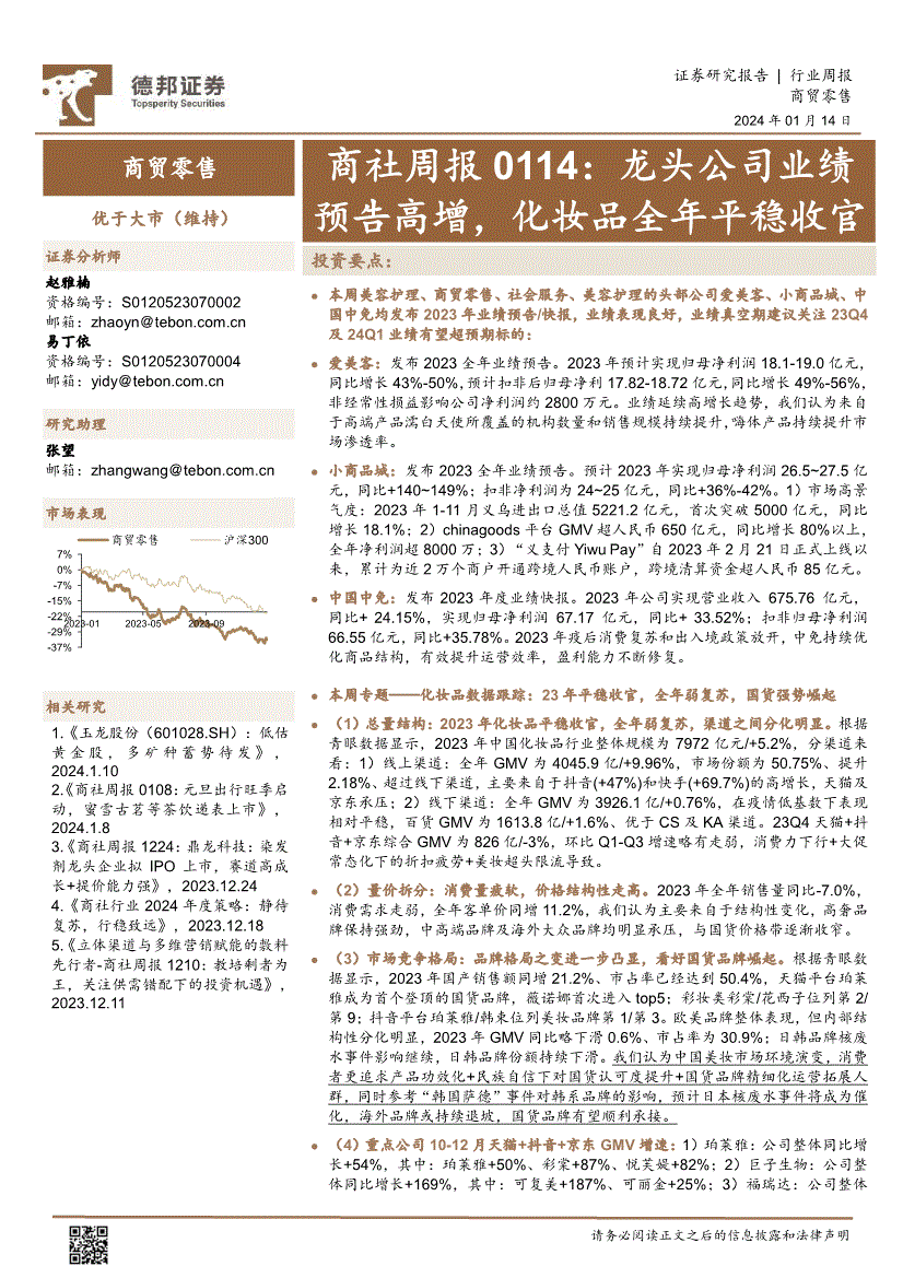 商社行业:德邦证券-商社行业周报0114:龙头公司业绩预告高增,化妆品全年平稳收官-240114