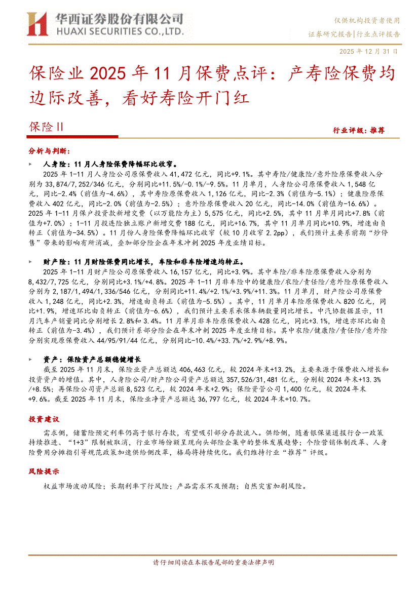 保险行业:华西证券-保险业2025年11月保费点评:产寿险保费均边际改善,看好寿险开门红-251231
