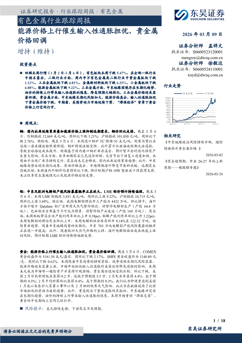 有色金属行业:东吴证券-有色金属行业跟踪周报:能源价格上行催生输入性通胀担忧,贵金属价格回调-260309