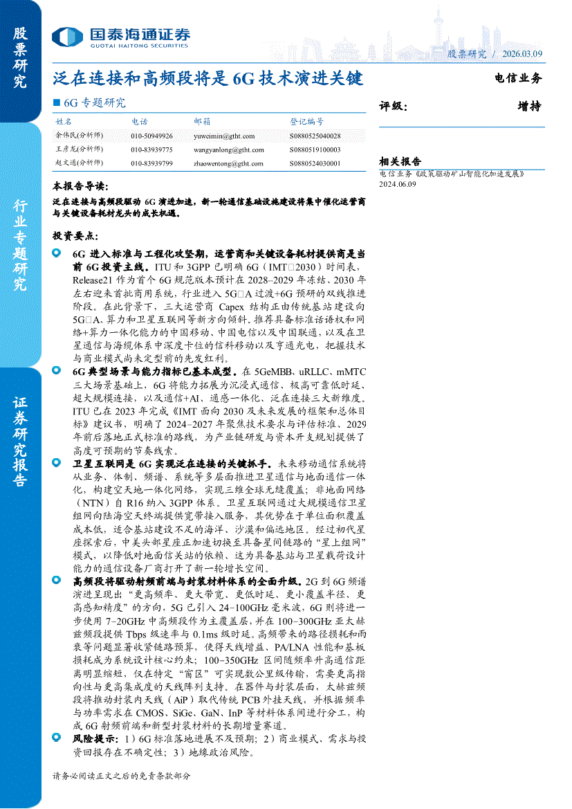 电信业务行业:国泰海通证券-电信业务行业6G专题研究:泛在连接和高频段将是6G技术演进关键-260309