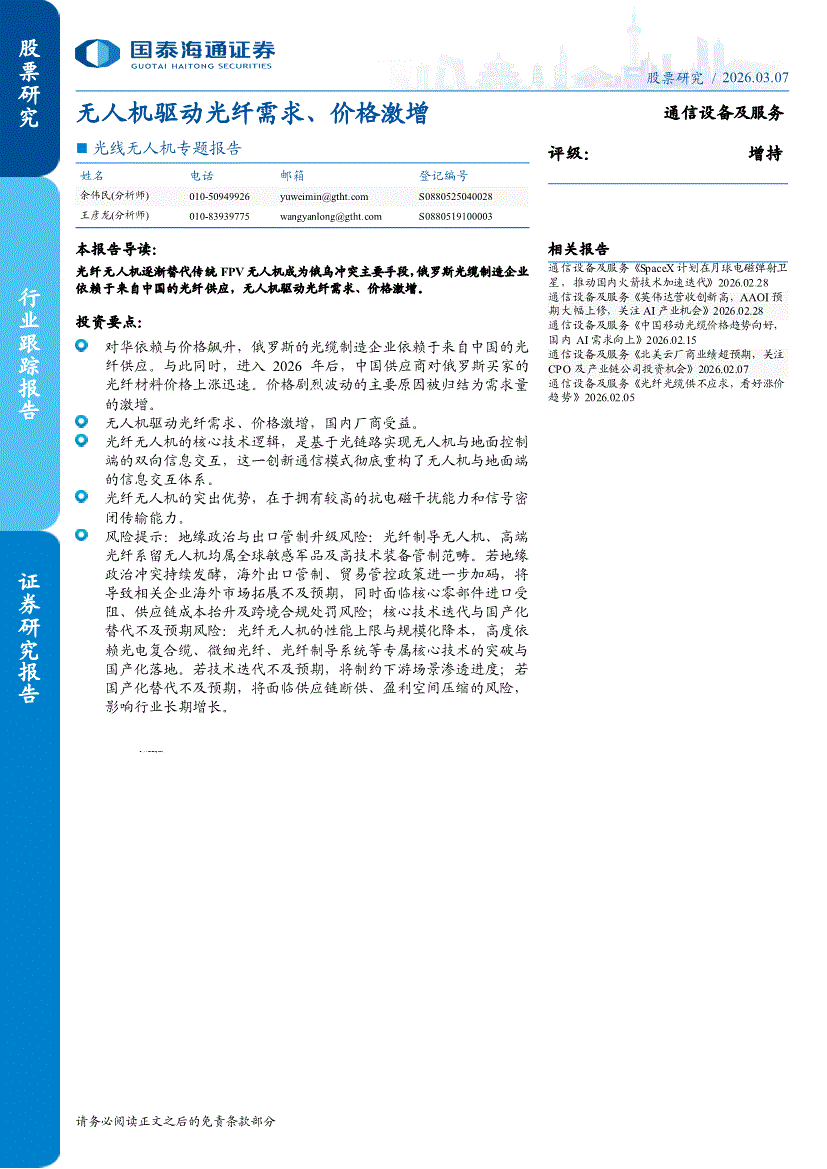 通信设备及服务行业:国泰海通证券-通信设备及服务行业光线无人机专题报告:无人机驱动光纤需求、价格激增-260307