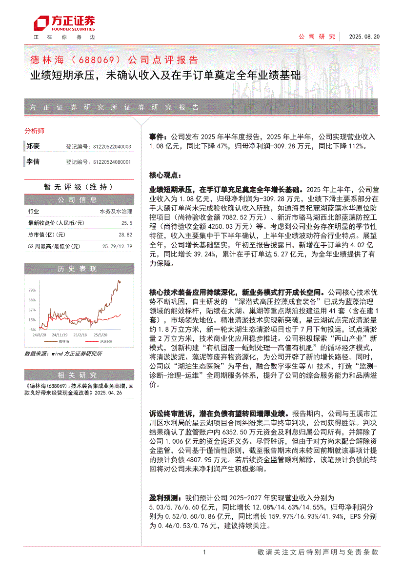 德林海:方正证券-德林海-688069-公司点评报告:业绩短期承压,未确认收入及在手订单奠定全年业绩基础-250820