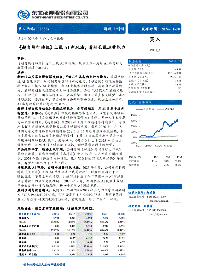 巨人网络:东北证券-巨人网络-002558-《超自然行动组》上线AI新玩法,看好长线运营能力-260120