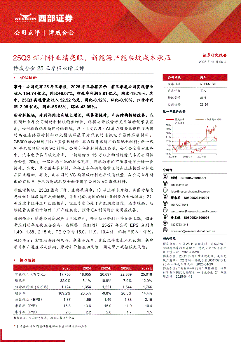 博威合金:西部证券-博威合金-601137-25三季报业绩点评:25Q3新材料业绩亮眼,新能源产能爬坡成本承压-251106