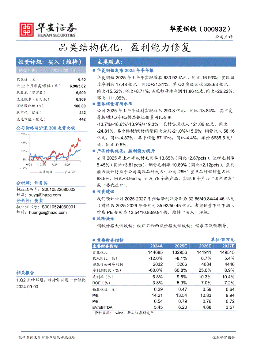华菱钢铁:华安证券-华菱钢铁-000932-品类结构优化,盈利能力修复-250926