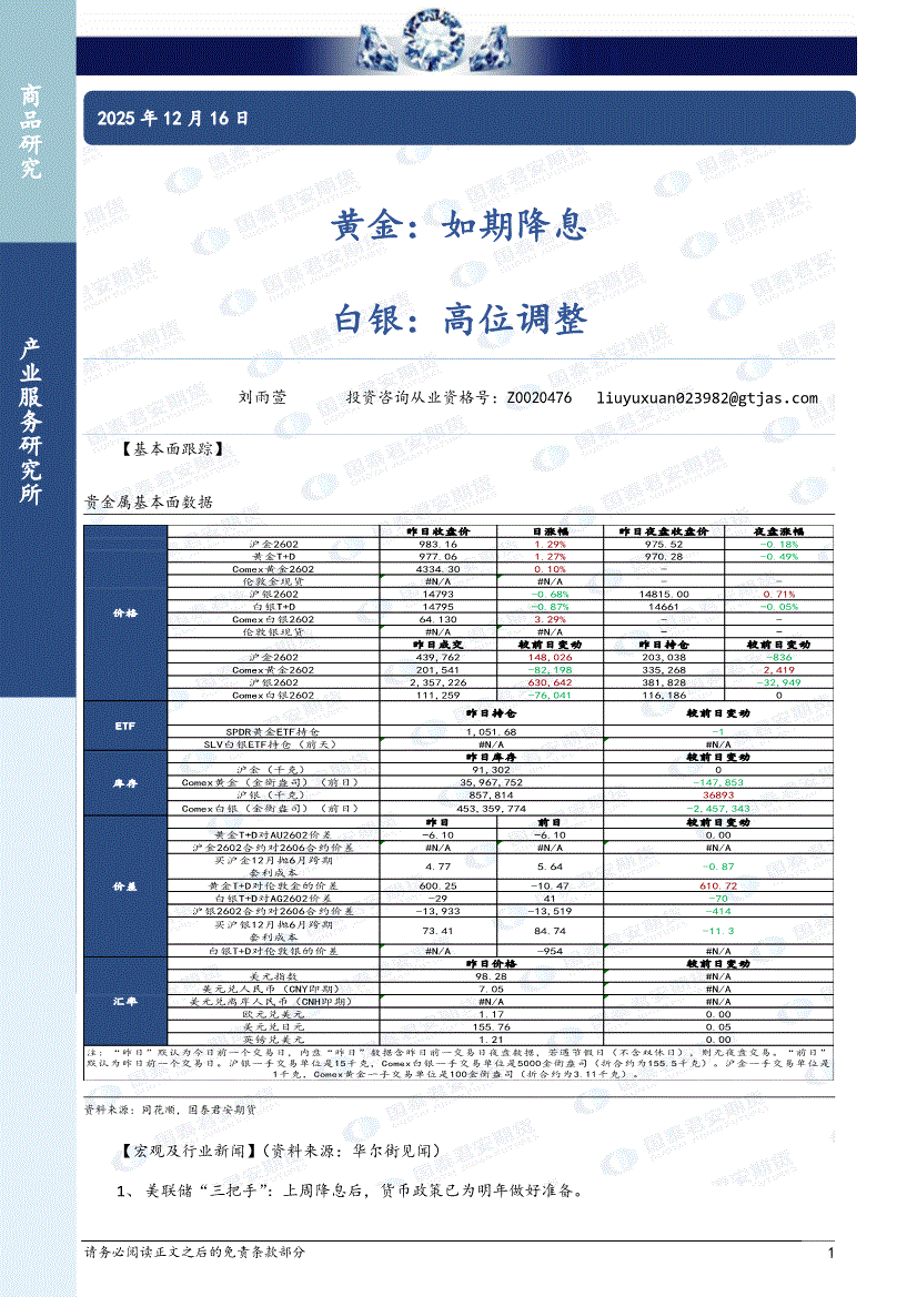 国泰君安期货-黄金:如期降息,白银,高位调整-251216