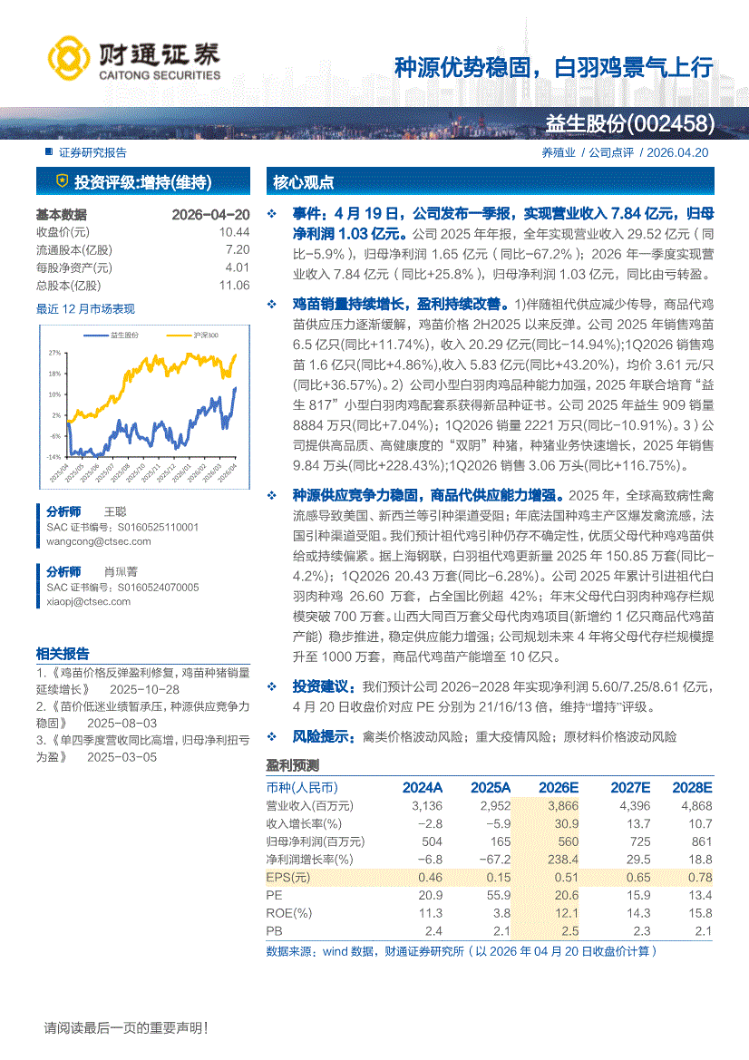 益生股份:财通证券-益生股份-002458-种源优势稳固,白羽鸡景气上行-260420