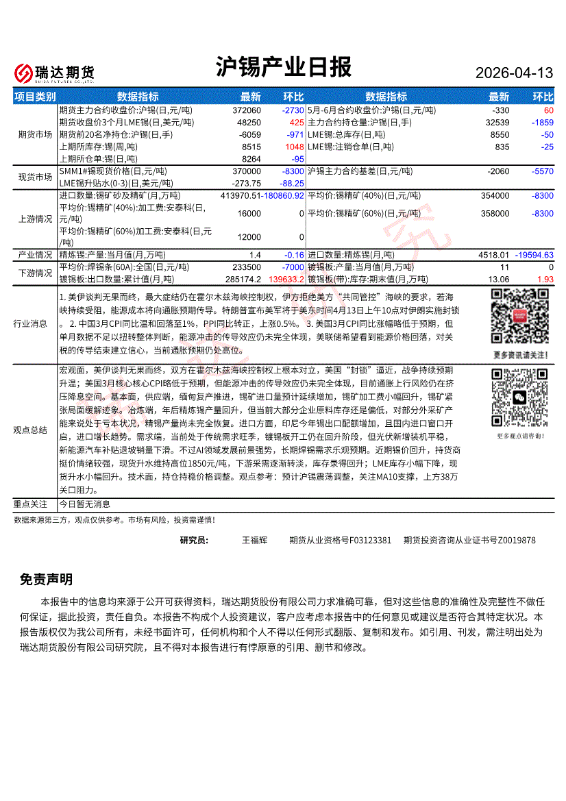 瑞达期货-沪锡市场周报:情绪改善采需稳定,预计锡价震荡偏强-260417