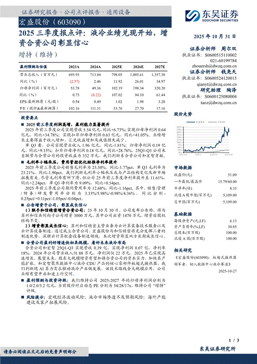 宏盛股份:东吴证券-宏盛股份-603090-2025三季度报点评:液冷业绩兑现开始,增资合资公司彰显信心-251031
