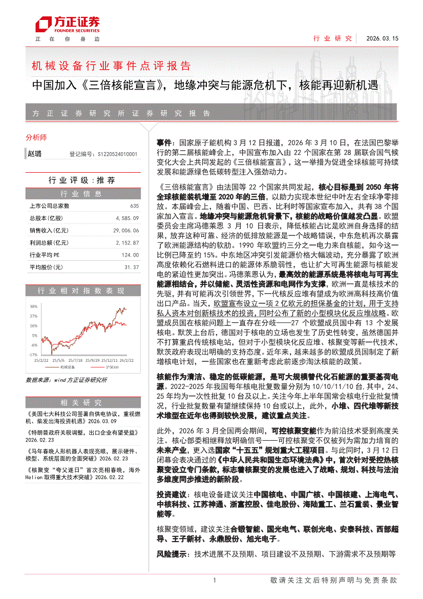 机械设备行业:方正证券-机械设备行业事件点评报告:中国加入《三倍核能宣言》,地缘冲突与能源危机下,核能再迎新机遇-260315