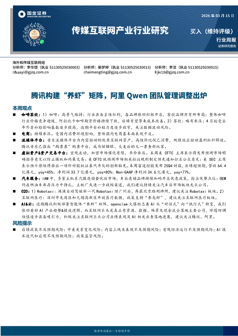 传媒互联网行业:国金证券-传媒互联网产业行业周报:腾讯构建“养虾”矩阵,阿里Qwen团队管理调整出炉-260315