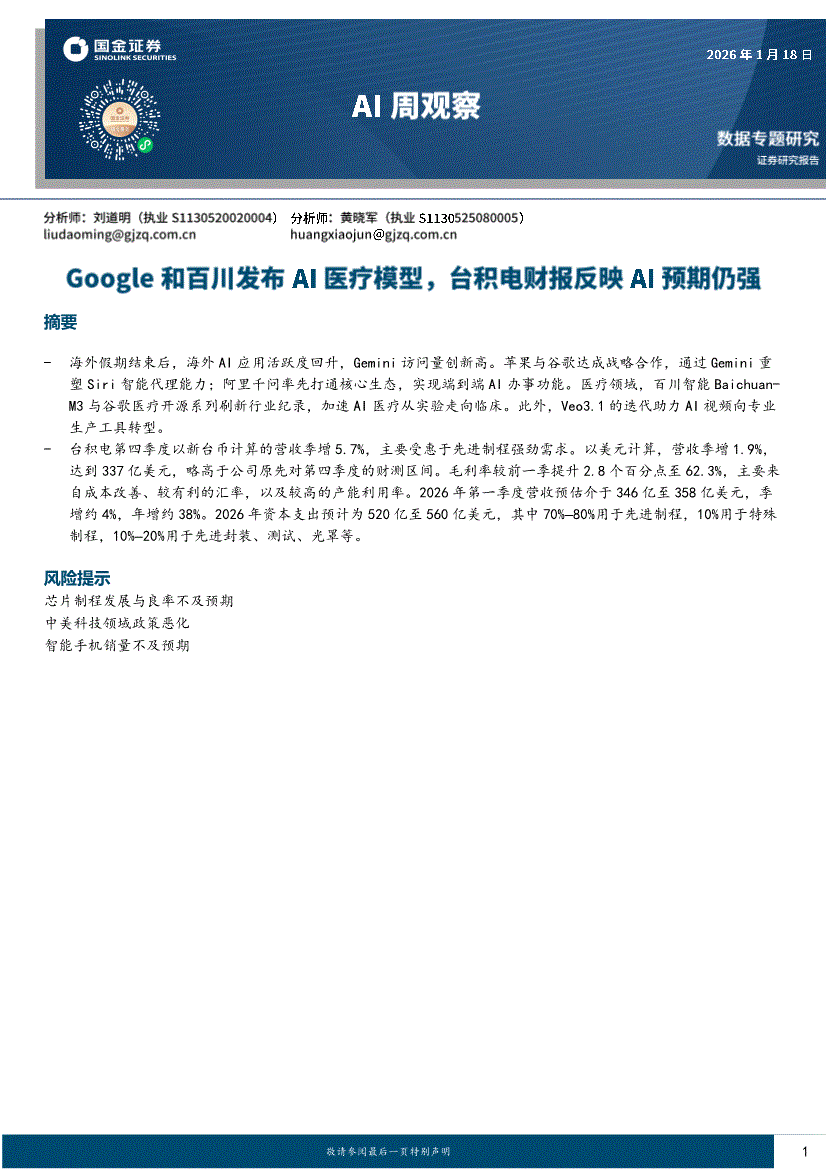 AI行业:国金证券-AI行业周观察:Google和百川发布AI医疗模型,台积电财报反映AI预期仍强-260118