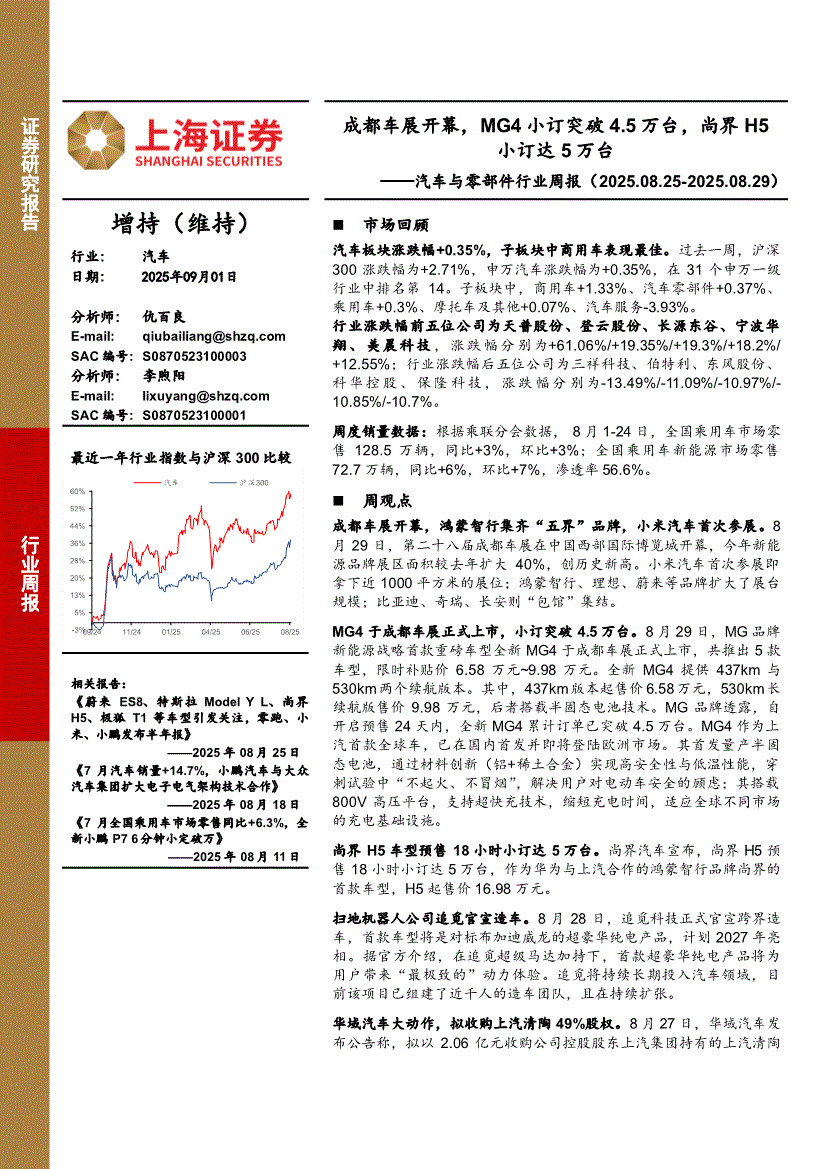 汽车与零部件行业:上海证券-汽车与零部件行业周报:成都车展开幕,MG4小订突破4.5万台,尚界H5小订达5万台-250901