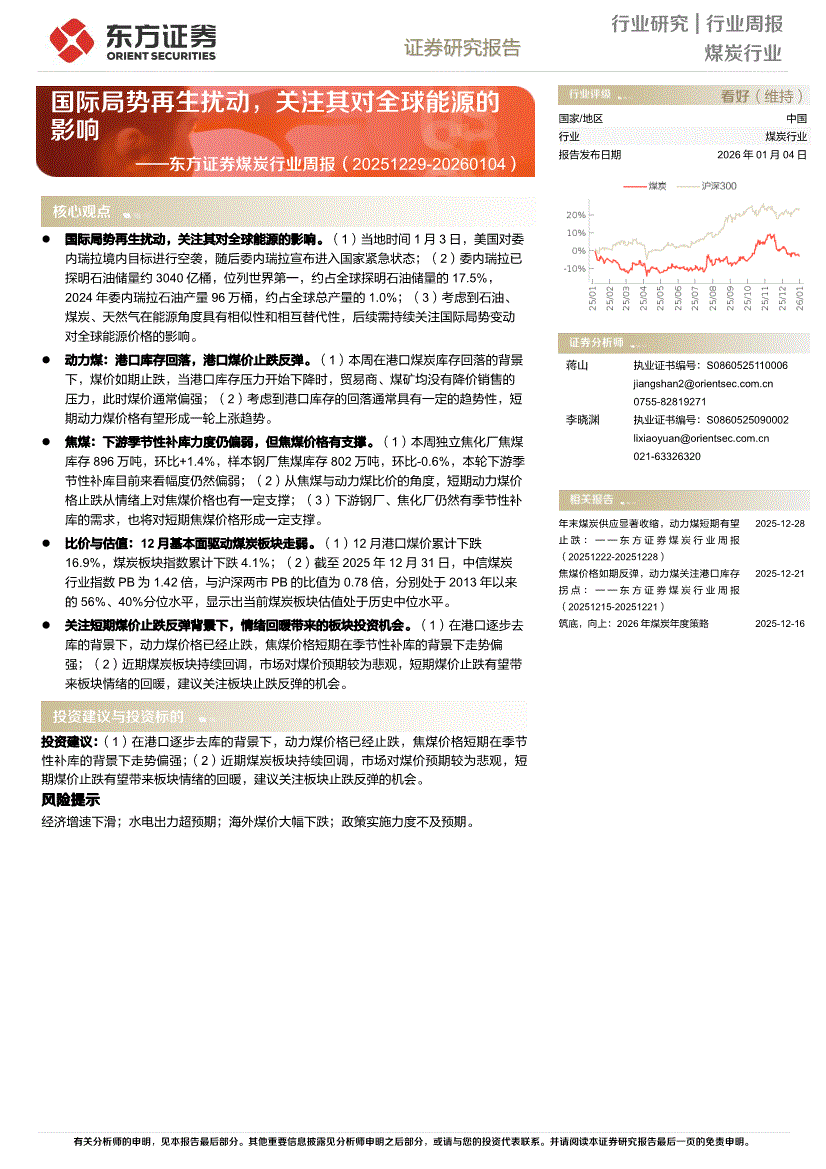 煤炭行业:东方证券-煤炭行业周报:国际局势再生扰动,关注其对全球能源的影响-260104