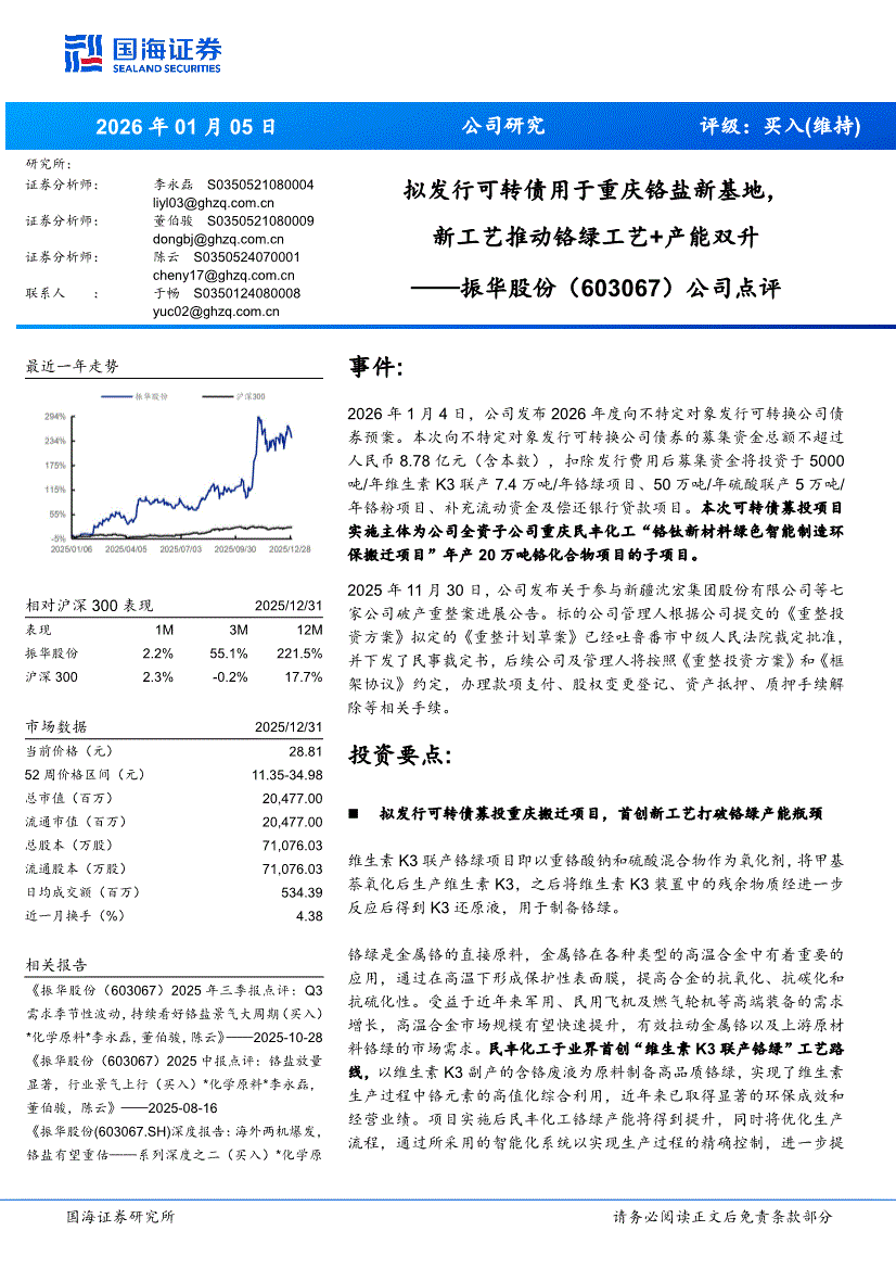 振华股份:国海证券-振华股份-603067-公司点评:拟发行可转债用于重庆铬盐新基地,新工艺推动铬绿工艺+产能双升-260105