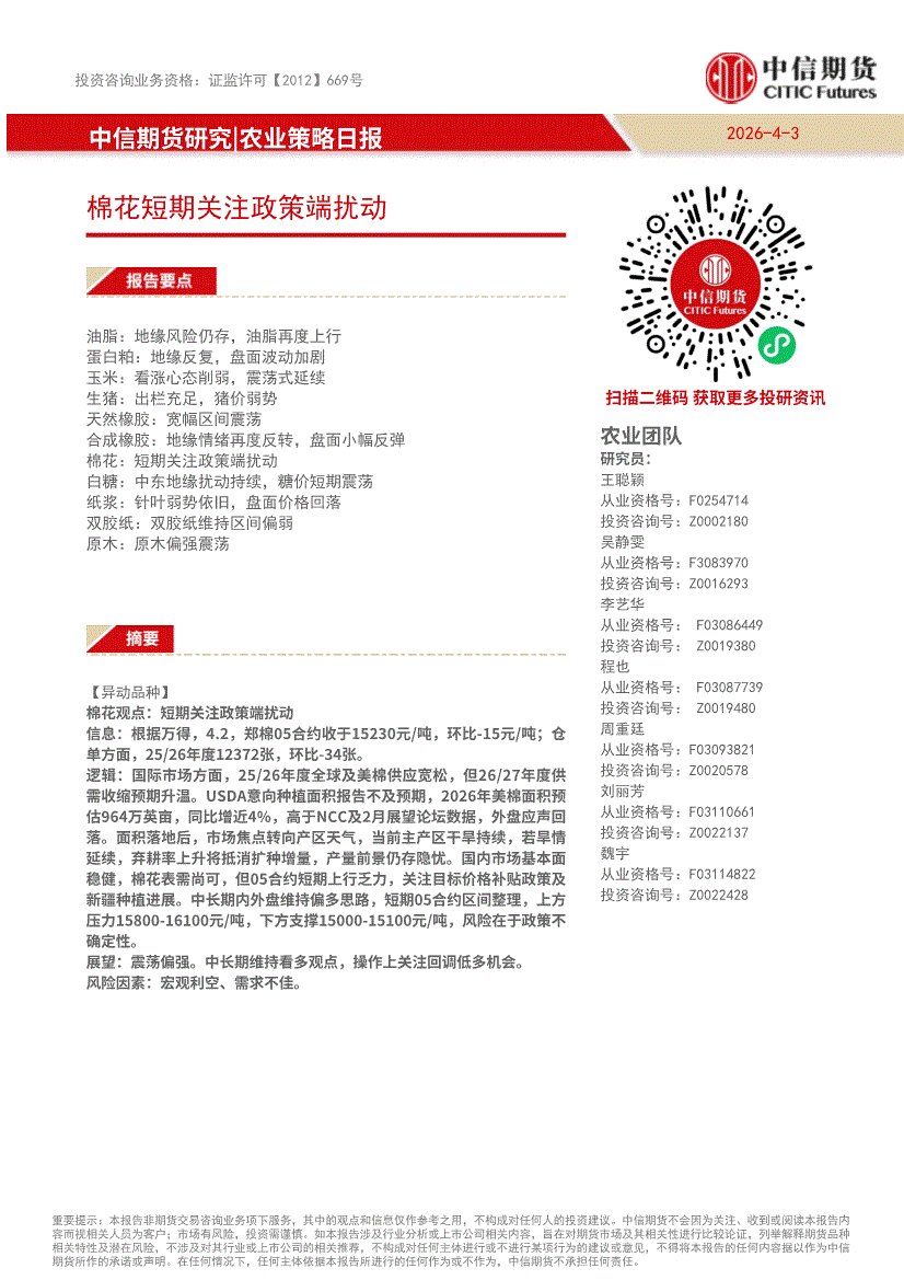 中信期货-农业策略日报:棉花短期关注政策端扰动-260403