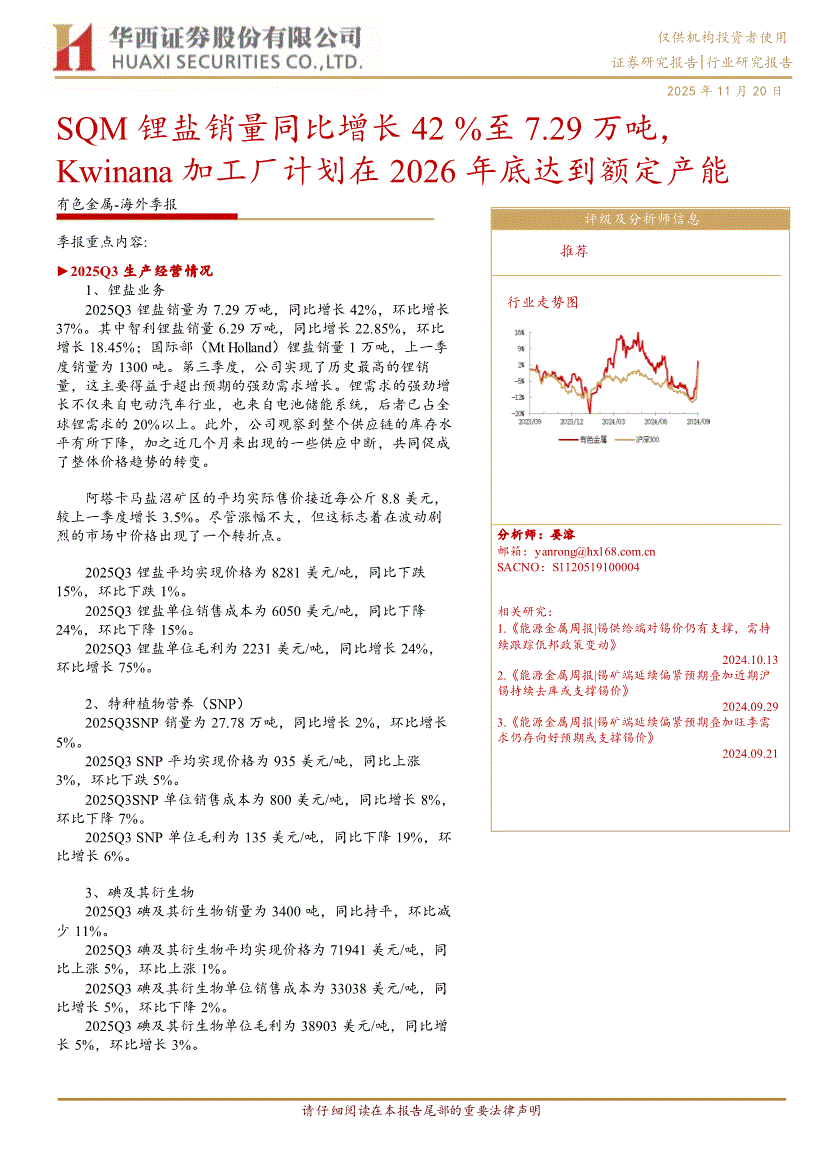 华西证券-有色金属行业~海外季报:SQM锂盐销量同比增长42%至7.29万吨,Kwinana加工厂计划在2026年底达到额定产能-251120