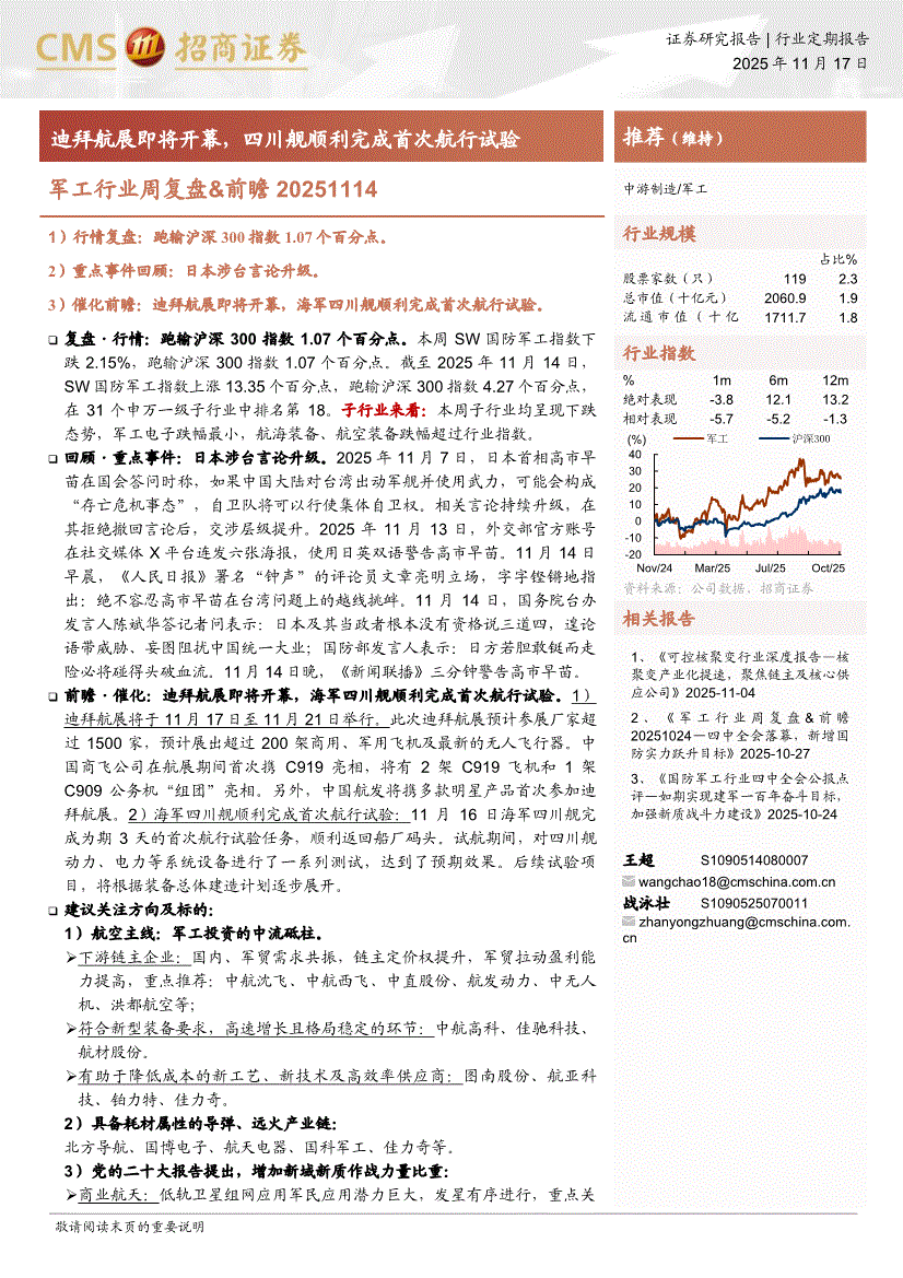 军工行业:招商证券-军工行业周复盘&前瞻:迪拜航展即将开幕,四川舰顺利完成首次航行试验-251117