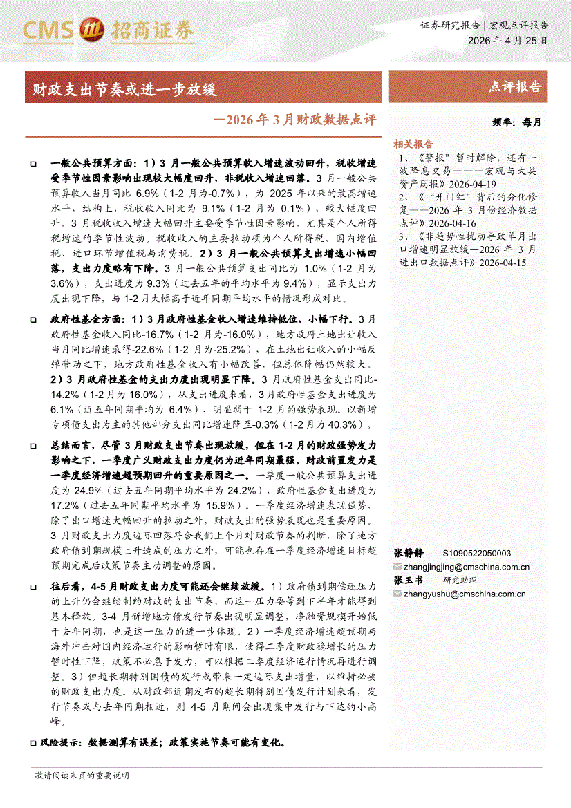 招商证券-2026年3月财政数据点评:财政支出节奏或进一步放缓-260425