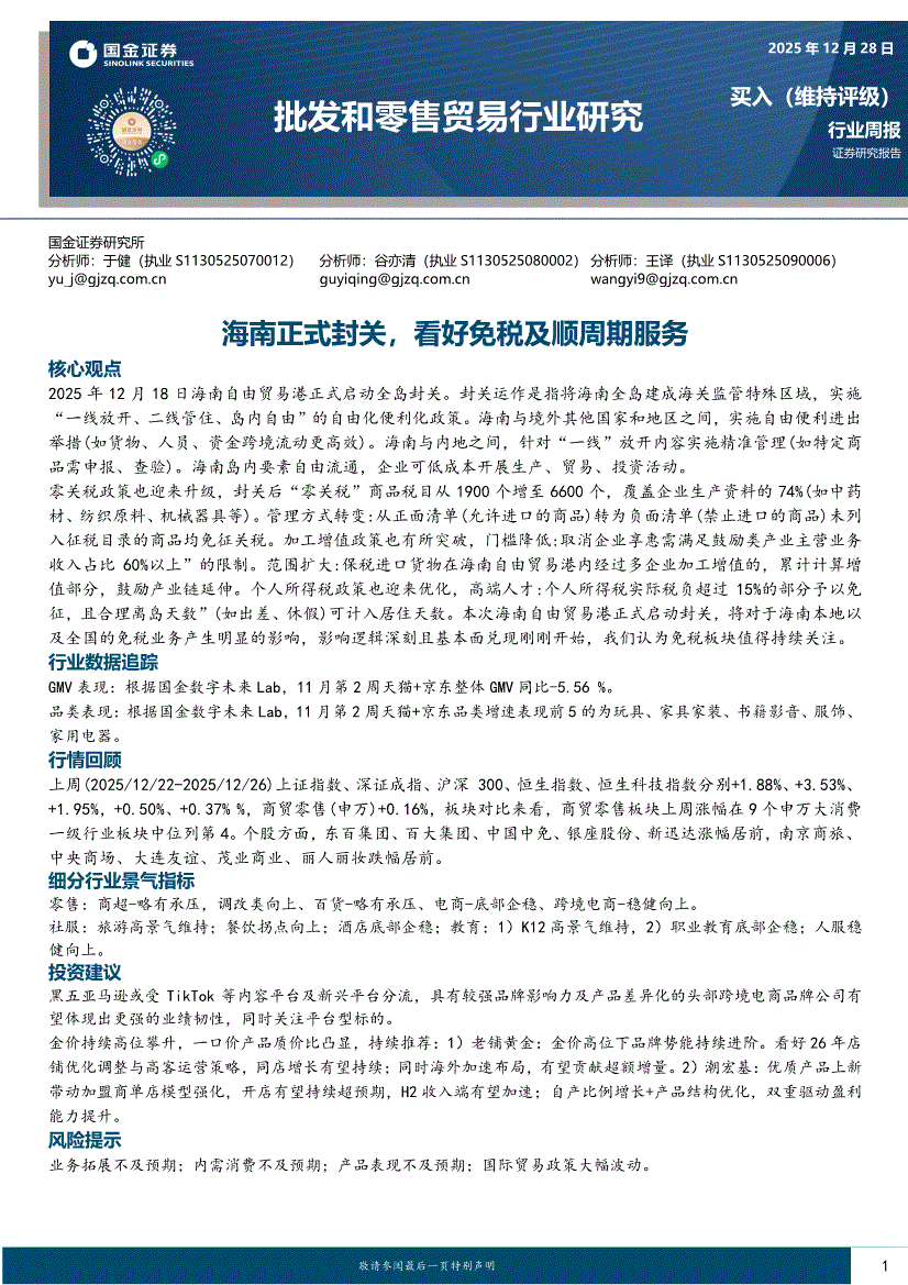 批发和零售贸易行业:国金证券-批发和零售贸易行业周报:海南正式封关,看好免税及顺周期服务-251228