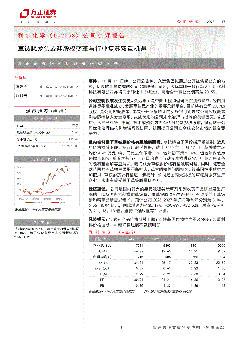 利尔化学:方正证券-利尔化学-002258-公司点评报告:草铵膦龙头或迎股权变革与行业复苏双重机遇-251117