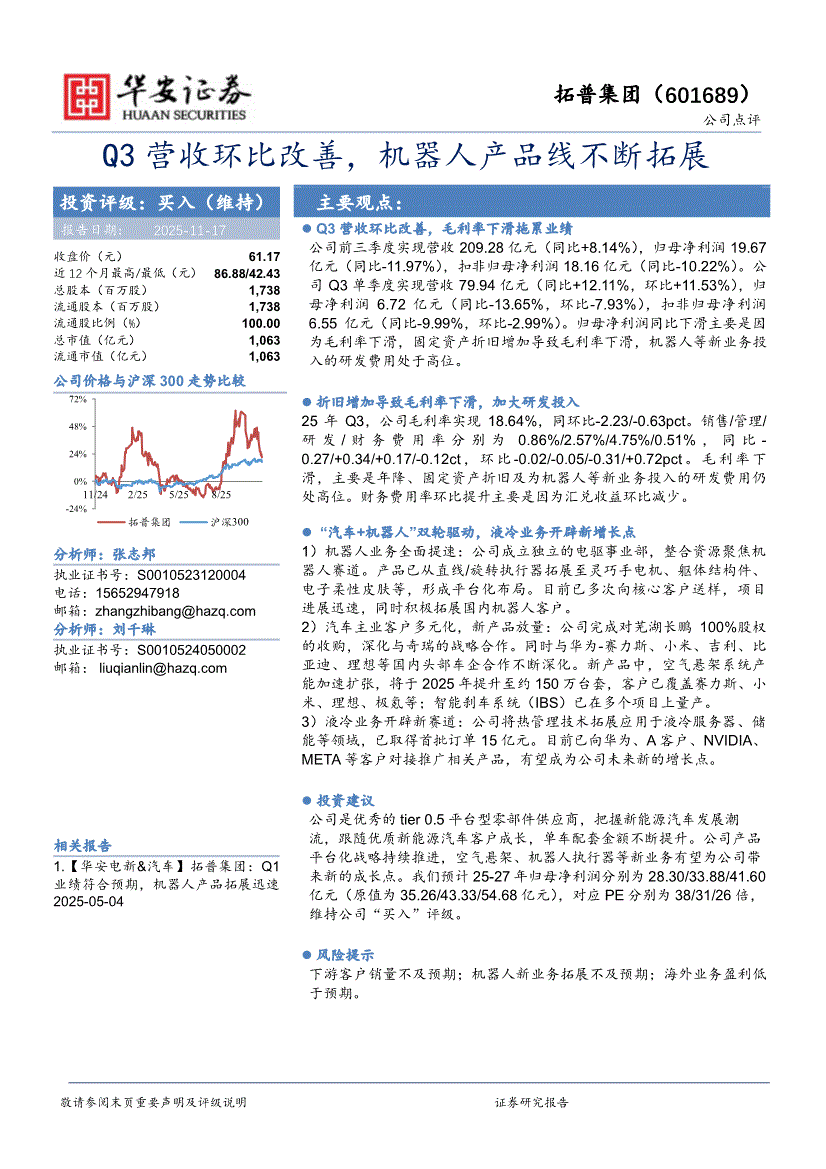 拓普集团:华安证券-拓普集团-601689-Q3营收环比改善,机器人产品线不断拓展-251117