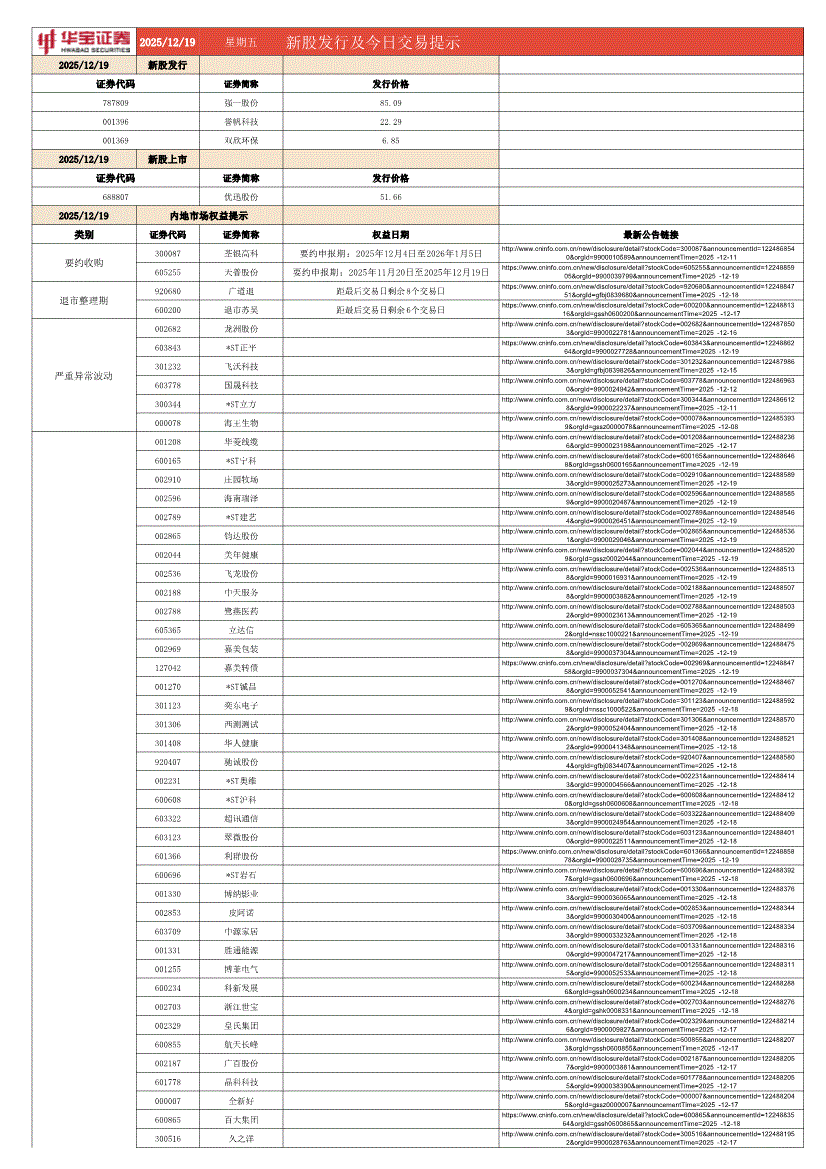 华宝证券-新股发行及今日交易提示-251219